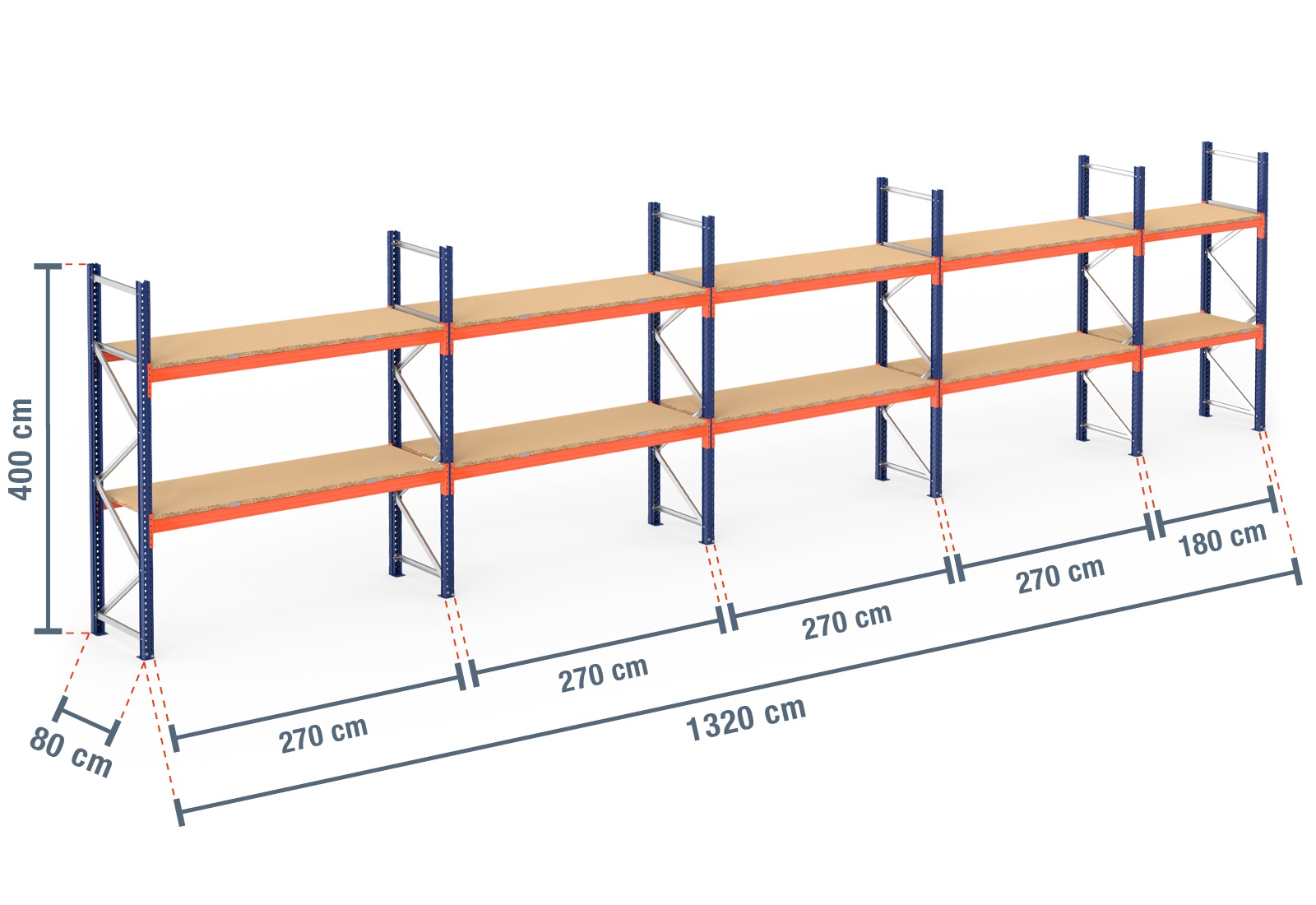 13,2 m pallet racking PR4500 / 80 cm deep / 4 m high / 2 levels / rack layer Wood