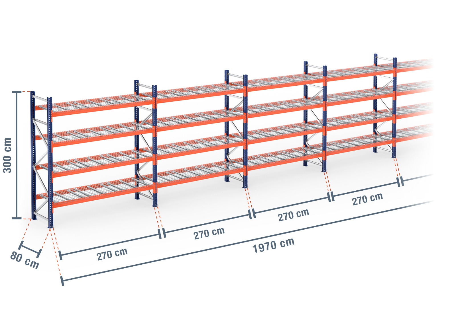 19,7 m pallet racking PR4500 / 80 cm deep / 3 m high / 4 levels / rack layer Wire mesh