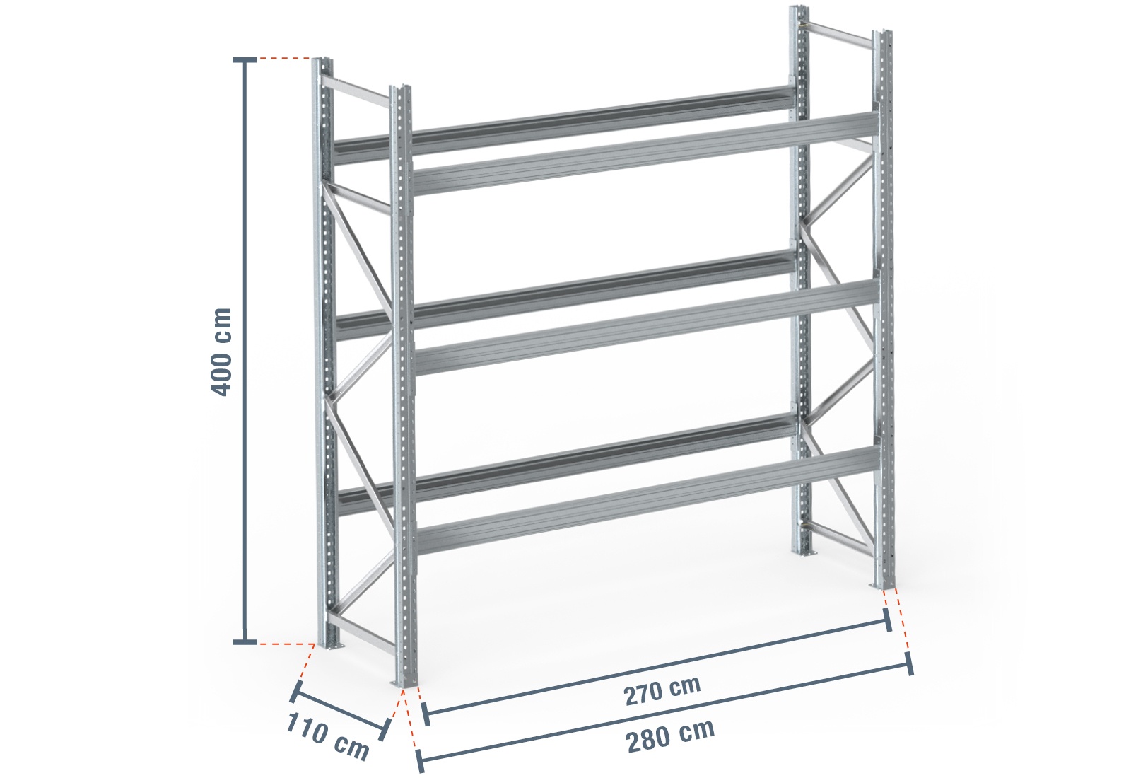 2,8 m pallet rack PR9000F galvanised / 110 cm deep / 4 m high / 3 levels for 12 euro pallets