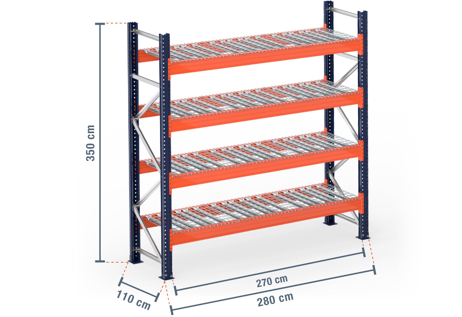 2,8 m pallet racking PR15000 / 110 cm deep / 3,5 m high / 4 levels / rack layer Wire mesh