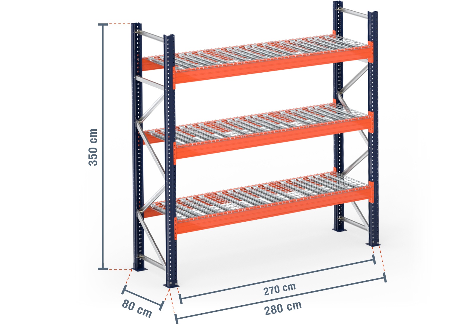 2,8 m pallet racking PR15000 / 80 cm deep / 3,5 m high / 3 levels / rack layer Wire mesh