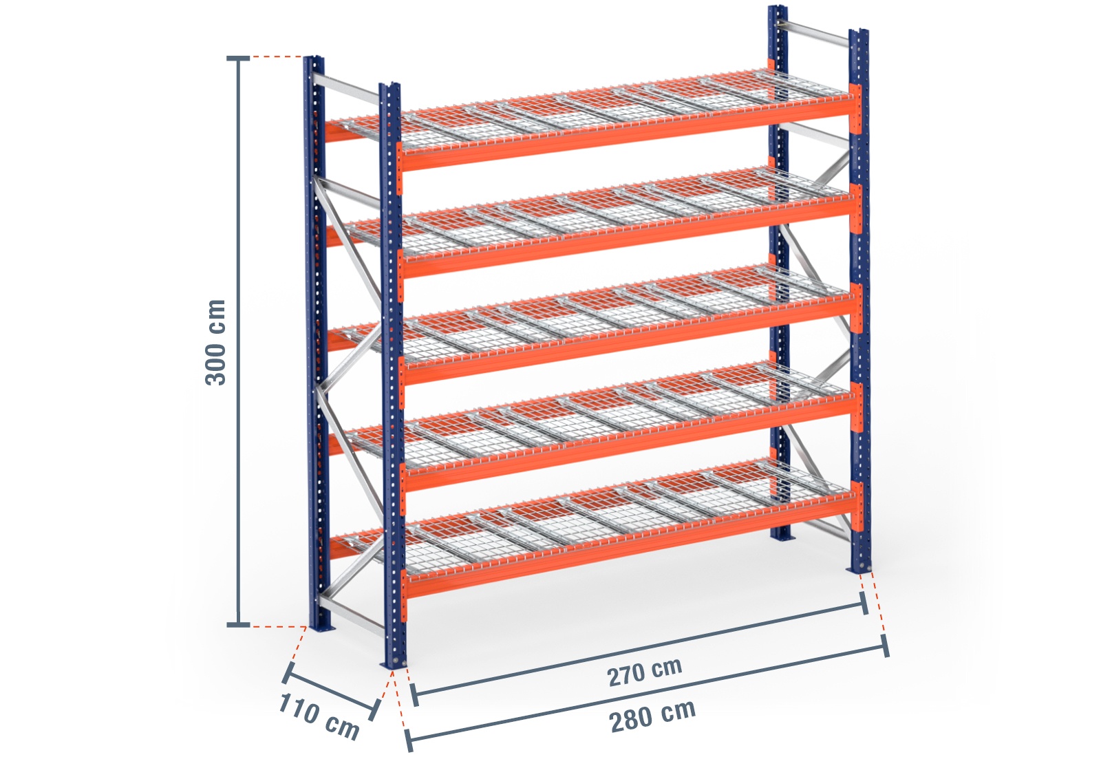 2,8 m pallet racking PR9000 / 110 cm deep / 3 m high / 5 levels / rack layer Wire mesh