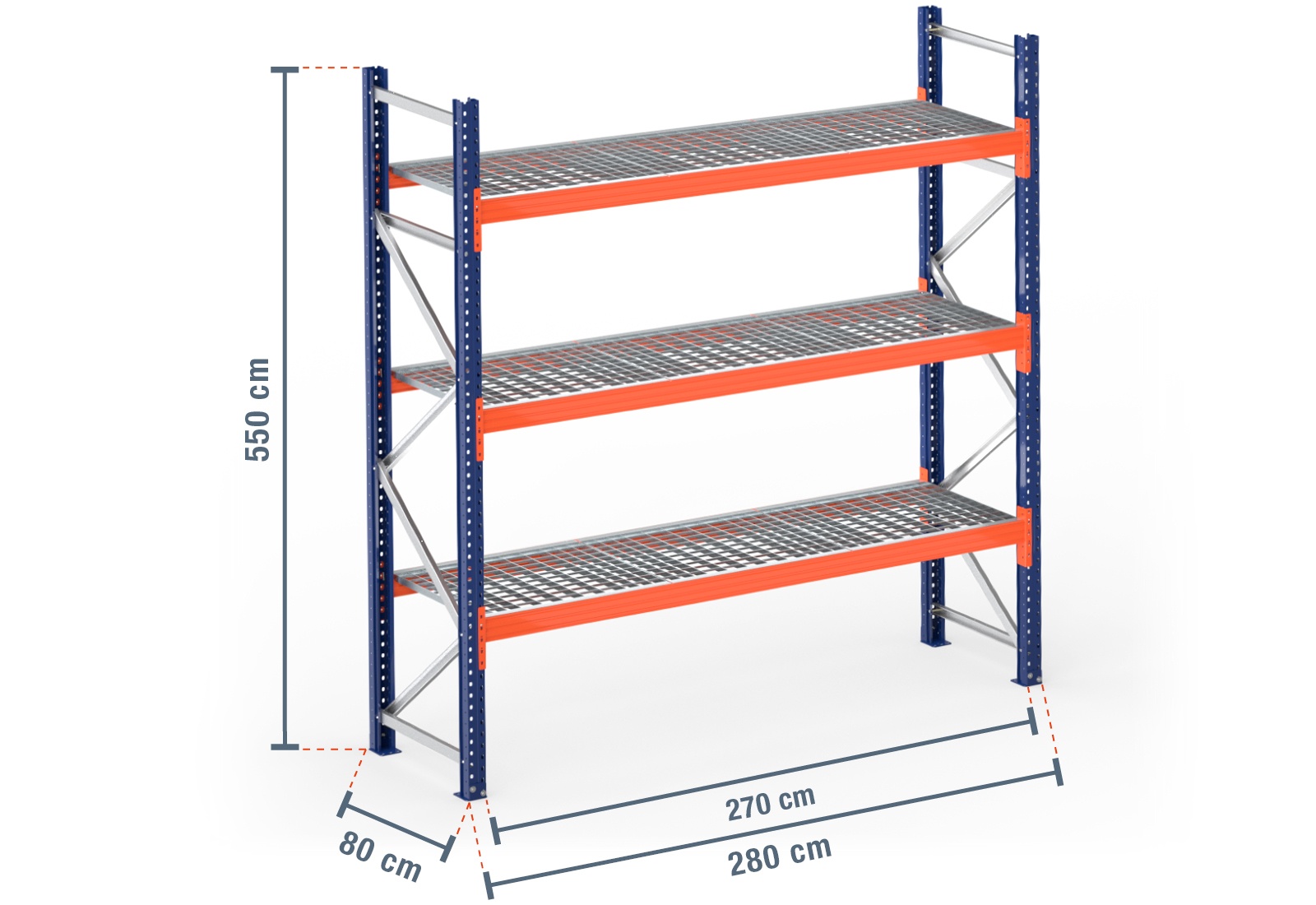 2,8 m pallet racking PR9000 / 80 cm deep / 5,5 m high / 3 levels / rack layer Galvanised mesh