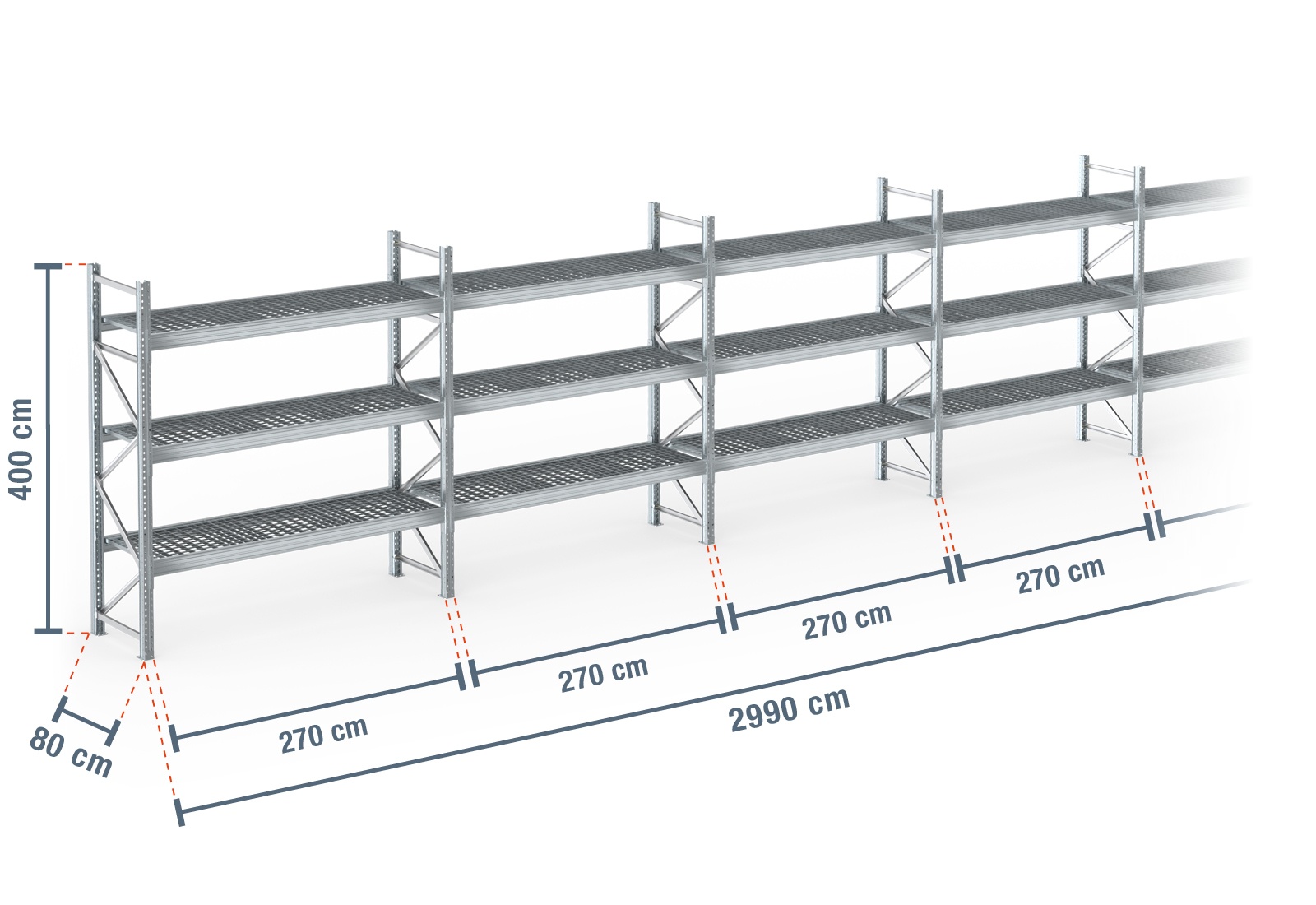 29,9 m pallet rack PR9000F galvanised / 80 cm deep / 4 m high / 3 levels / rack layer Galvanised mesh