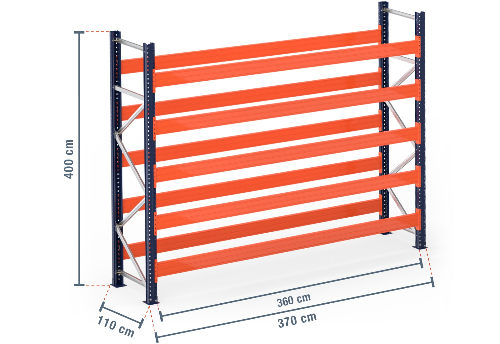 3,7 m pallet rack PR15000 / 110 cm deep / 4 m high / 5 levels for 26 euro pallets