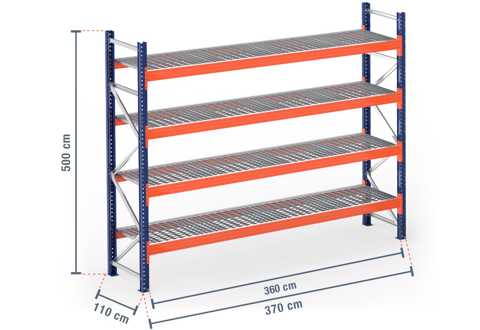 3,7 m pallet rack PR4500 / 110 cm deep / 5 m high / 4 levels / shelf Galvanised mesh