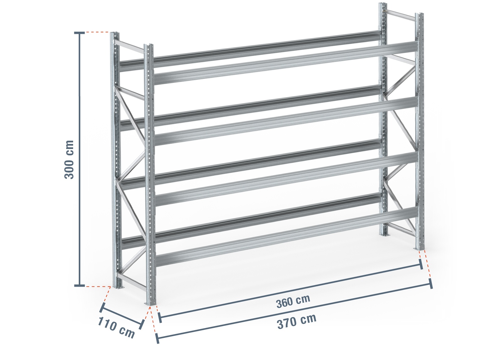 3,7 m pallet rack PR9000F galvanised / 110 cm deep / 3 m high / 4 levels for 20 euro pallets