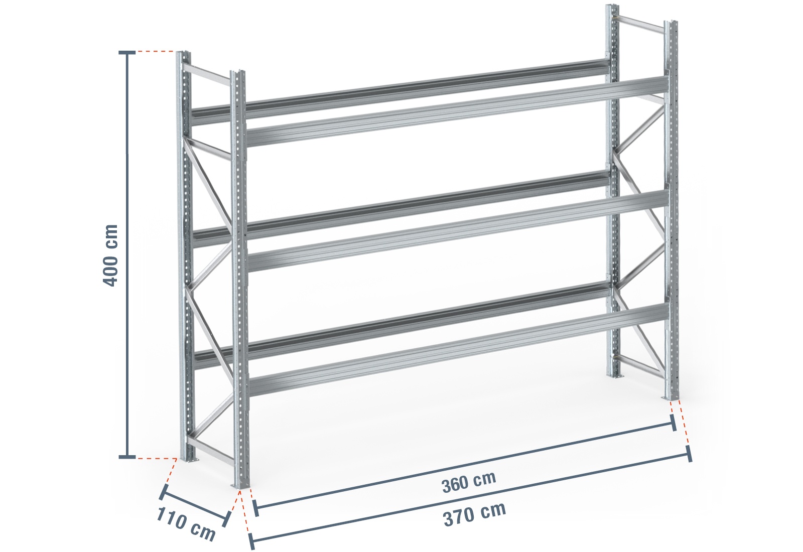 3,7 m pallet rack PR9000F galvanised / 110 cm deep / 4 m high / 3 levels for 16 euro pallets