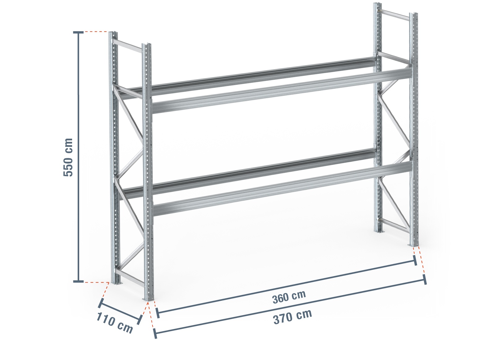 3,7 m pallet rack PR9000F galvanised / 110 cm deep / 5,5 m high / 2 levels for 12 euro pallets