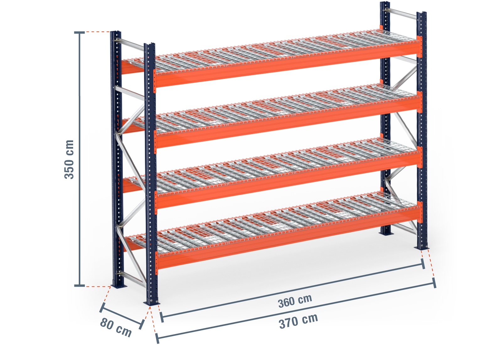 3,7 m pallet racking PR15000 / 80 cm deep / 3,5 m high / 4 levels / rack layer Wire mesh