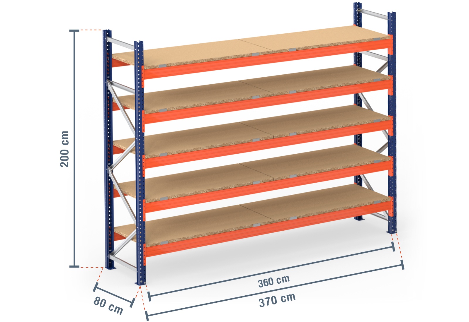 3,7 m pallet racking PR4500 / 80 cm deep / 2 m high / 5 levels / rack layer Wood