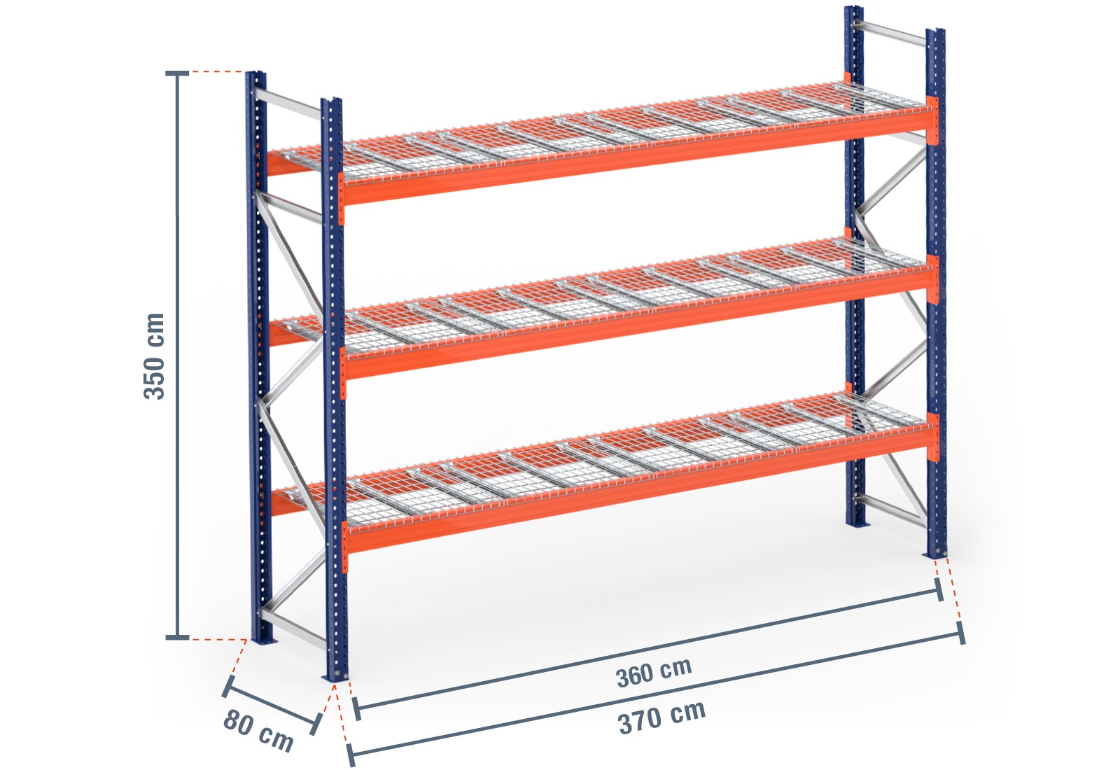 3,7 m pallet racking PR4500 / 80 cm deep / 3,5 m high / 3 levels / rack layer Wire mesh