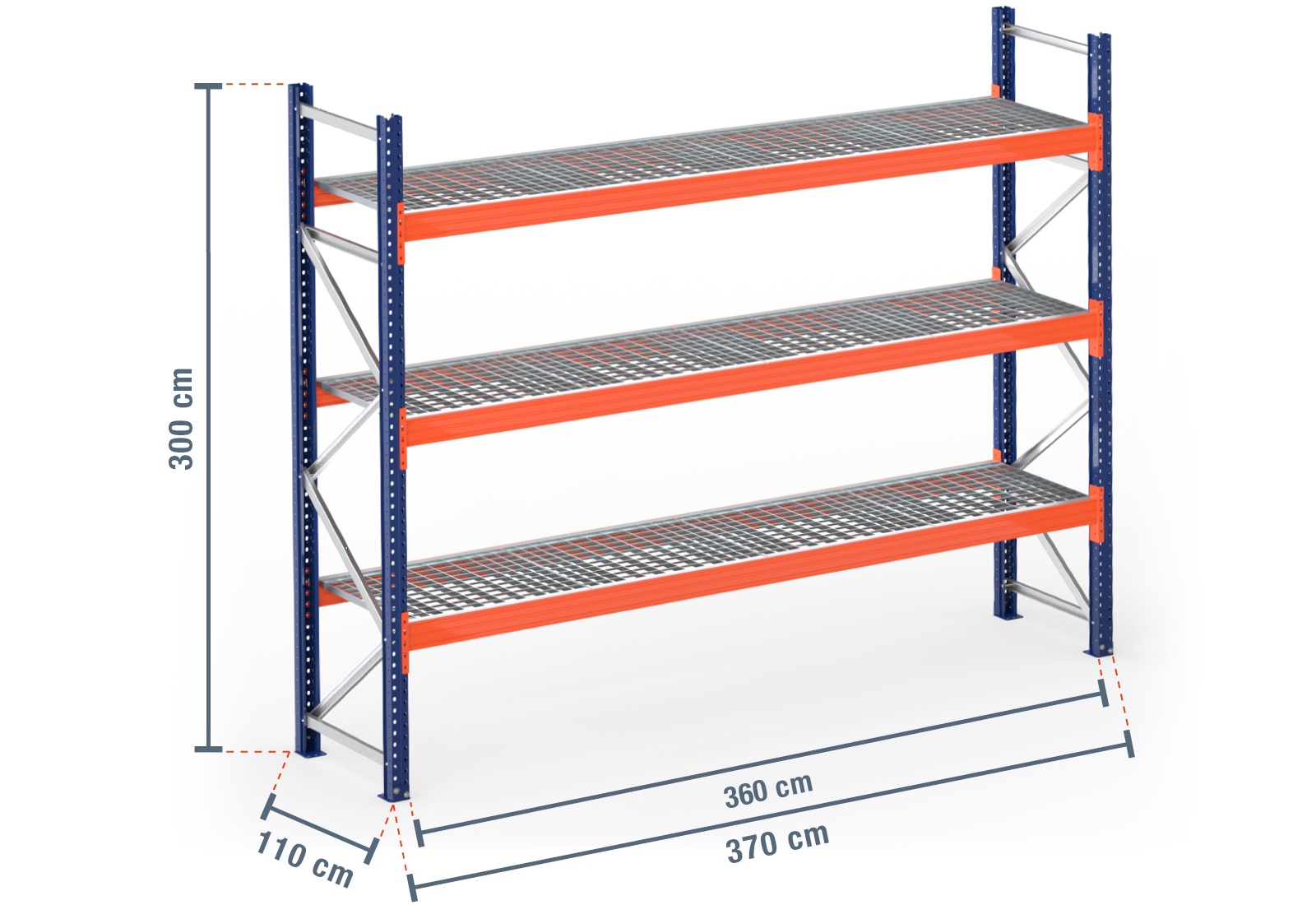 3,7 m pallet racking PR9000 / 110 cm deep / 3 m high / 3 levels / rack layer Galvanised mesh