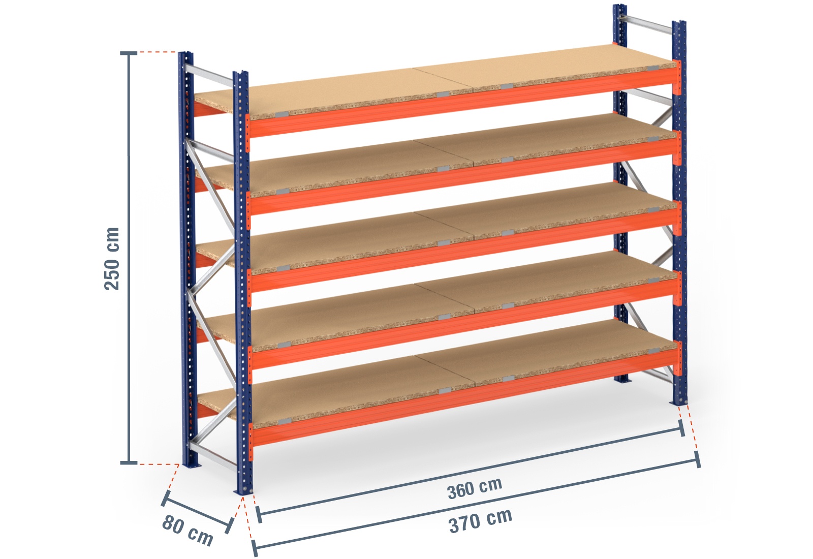 The practical wooden boards are made of 38 mm-thick chipboard panels, which are attached to the beams using four Z-plates. These robust shelf supports hold a total weight of 1.500 kg with an even load distribution; this load capacity can be increased with support bars. Wooden boards are therefore a low-cost alternative to more expensive steel boards and mesh shelves. When loading your pallet rack, please observe the maximum shelf and unit loads specified.