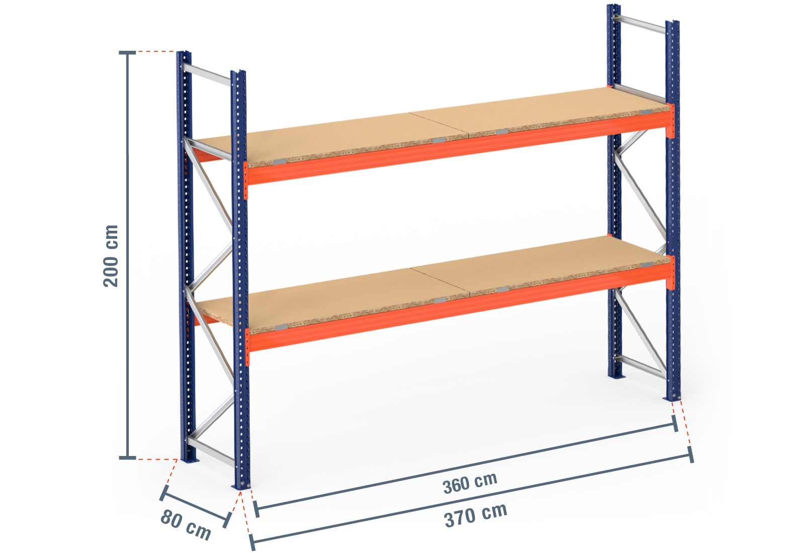3,7 m pallet racking PR9000 / 80 cm deep / 2 m high / 2 levels / rack layer Wood