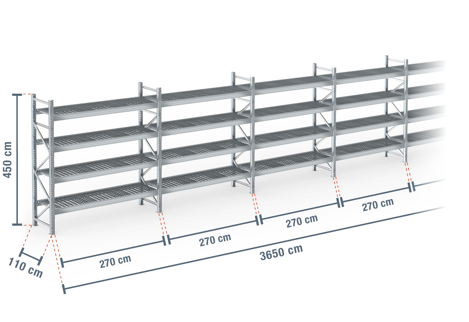 36,5 m pallet rack PR9000F galvanised / 110 cm deep / 4,5 m high / 4 levels / rack layer Galvanised mesh