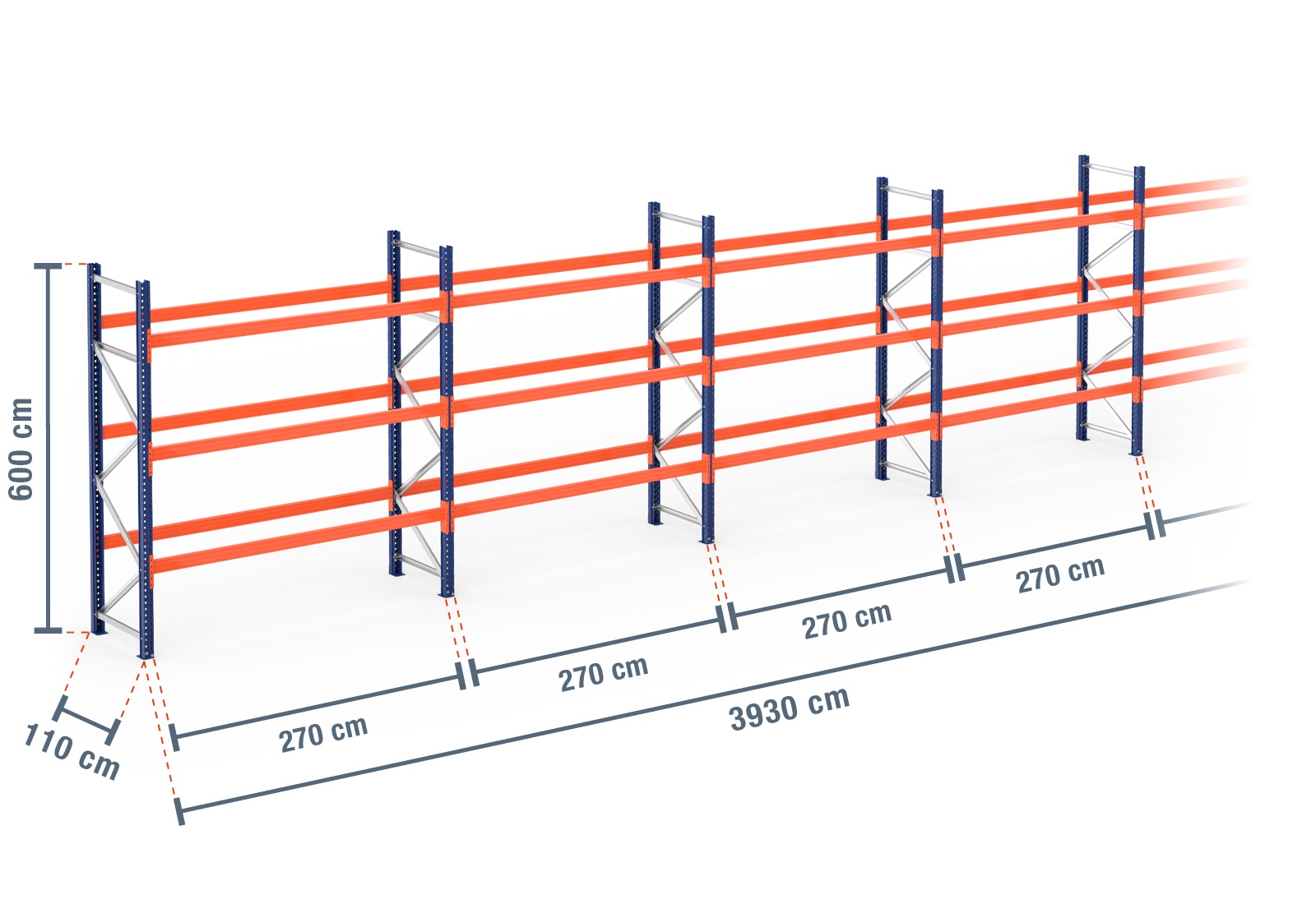 39,3 m pallet rack PR4500 / 110 cm deep / 6 m high / 3 levels for 168 euro pallets