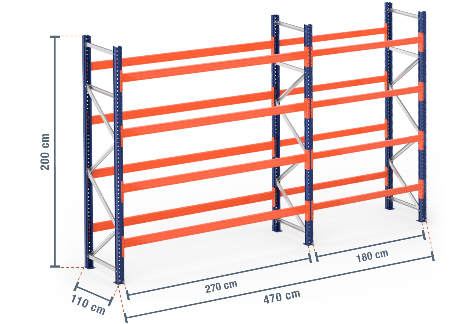 4,7 m pallet rack PR9000 / 110 cm deep / 2 m high / 4 levels for 25 euro pallets