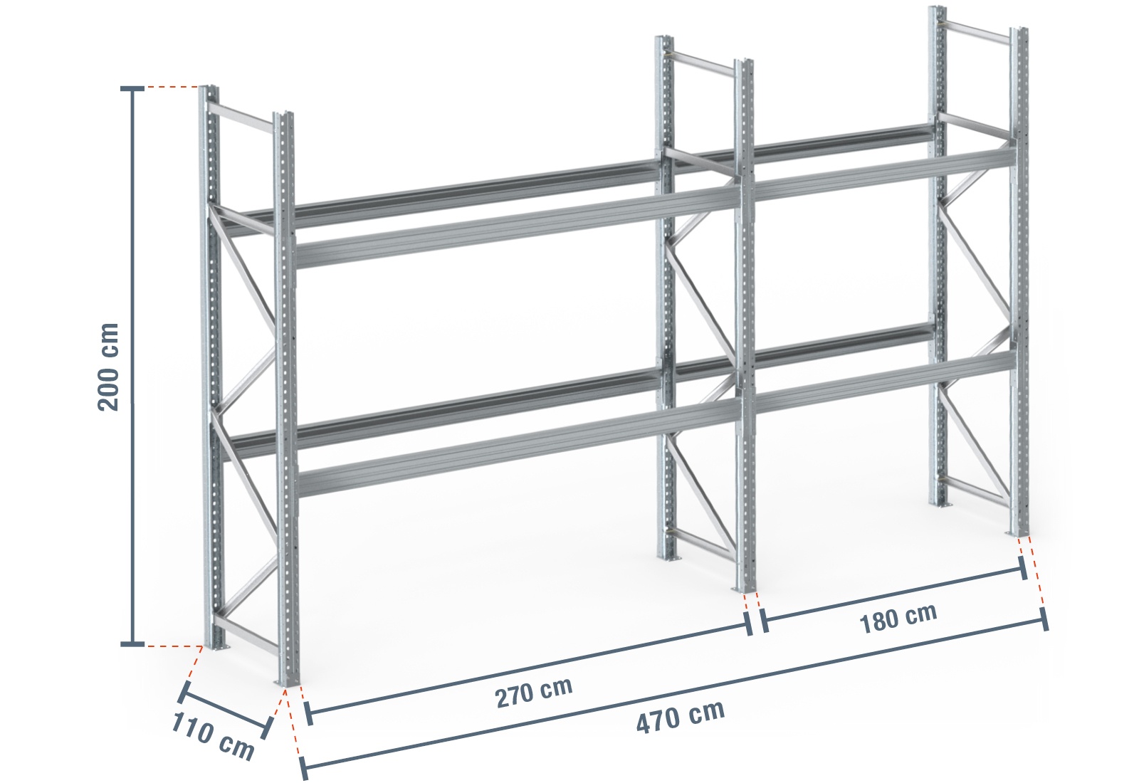 4,7 m pallet rack PR9000F galvanised / 110 cm deep / 2 m high / 2 levels for 15 euro pallets