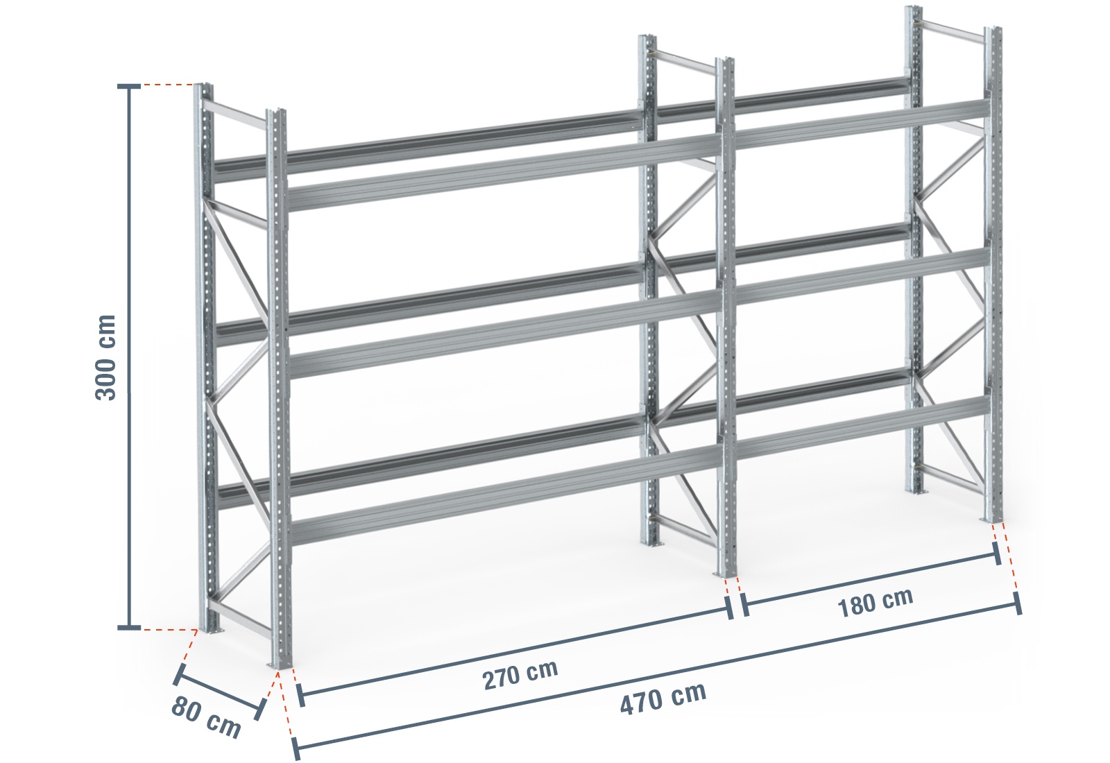 4,7 m pallet rack PR9000F galvanised / 80 cm deep / 3 m high / 3 levels for 20 euro pallets