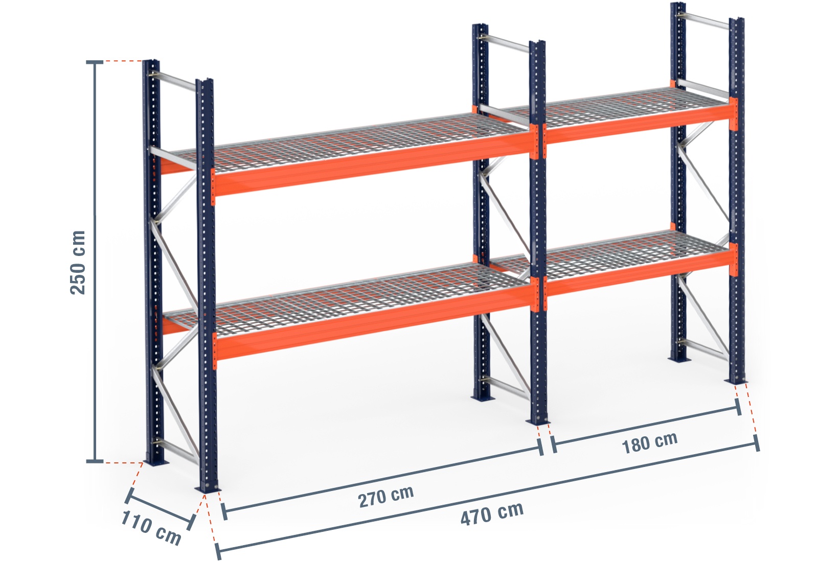 4,7 m pallet racking PR15000 / 110 cm deep / 2,5 m high / 2 levels / rack layer Galvanised mesh