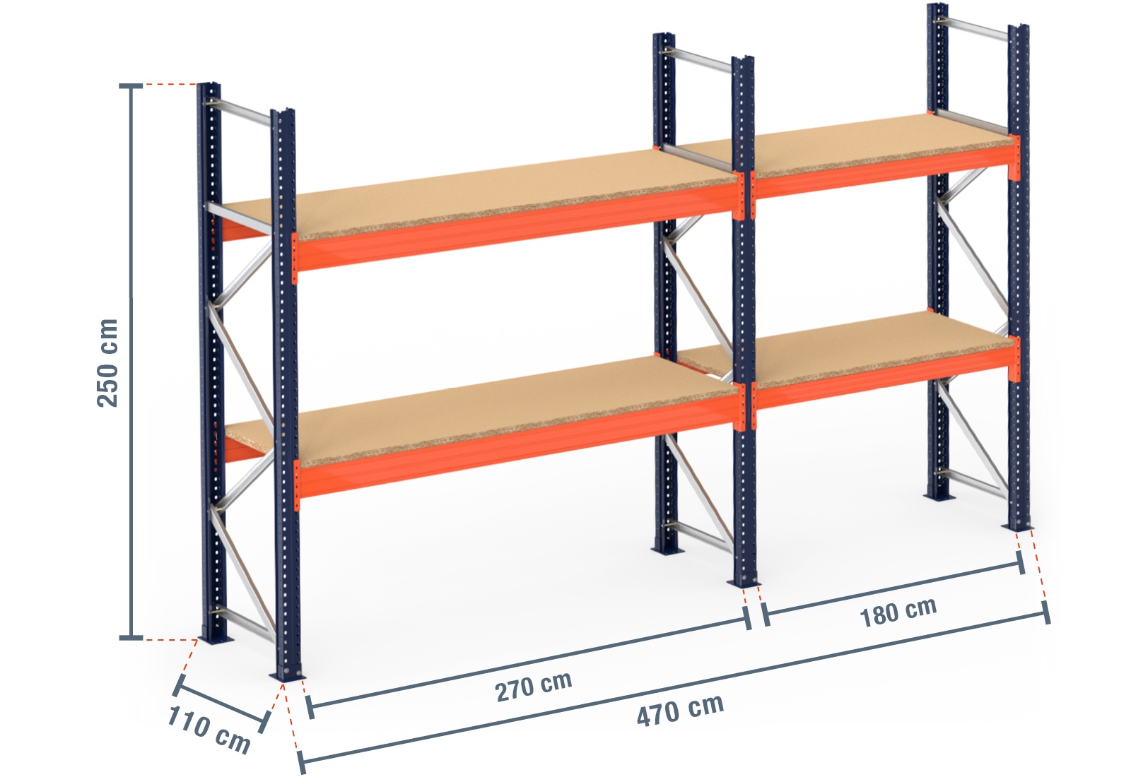 4,7 m pallet racking PR15000 / 110 cm deep / 2,5 m high / 2 levels / rack layer Wood