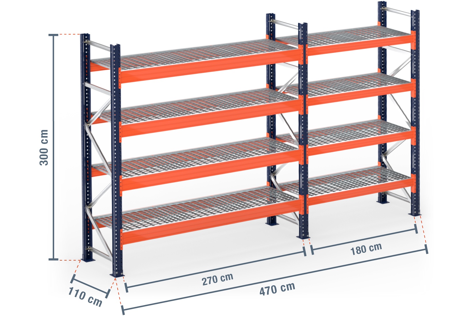 4,7 m pallet racking PR15000 / 110 cm deep / 3 m high / 4 levels / rack layer Galvanised mesh