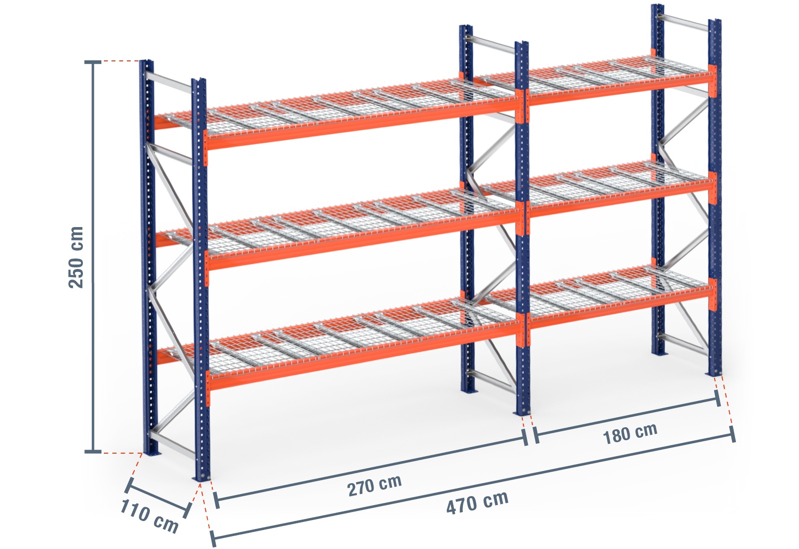 4,7 m pallet racking PR4500 / 110 cm deep / 2,5 m high / 3 levels / rack layer Wire mesh