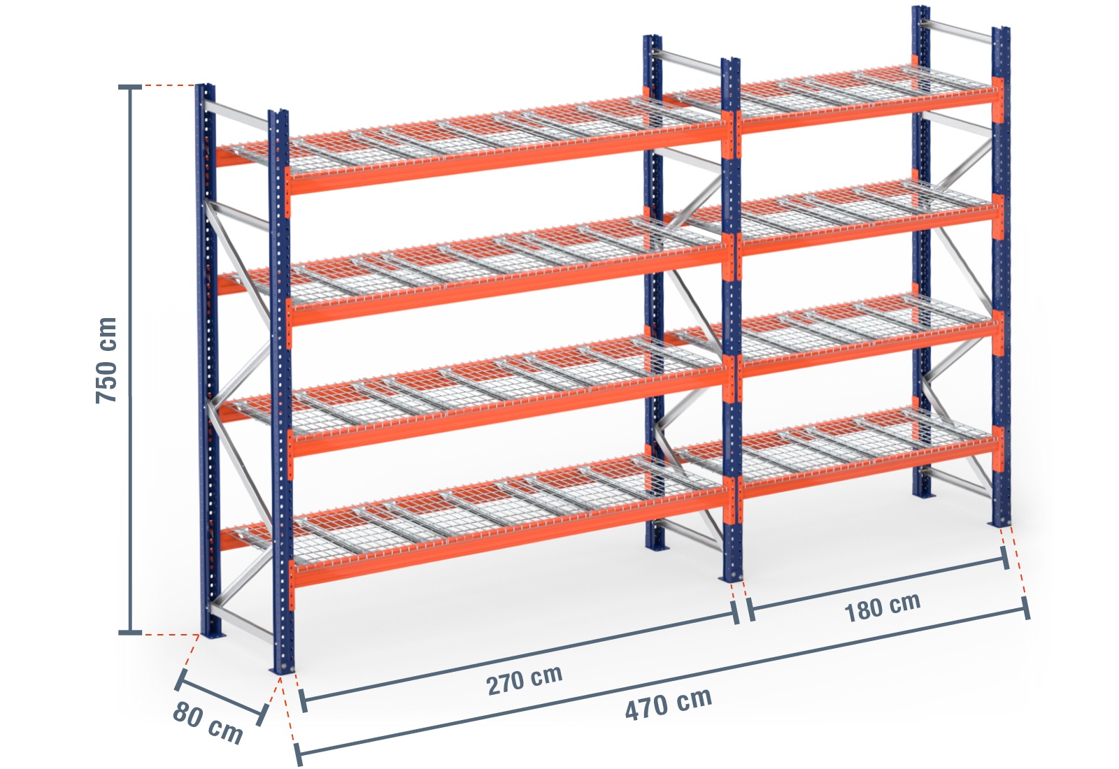 4,7 m pallet racking PR4500 / 80 cm deep / 7,5 m high / 4 levels / rack layer Wire mesh