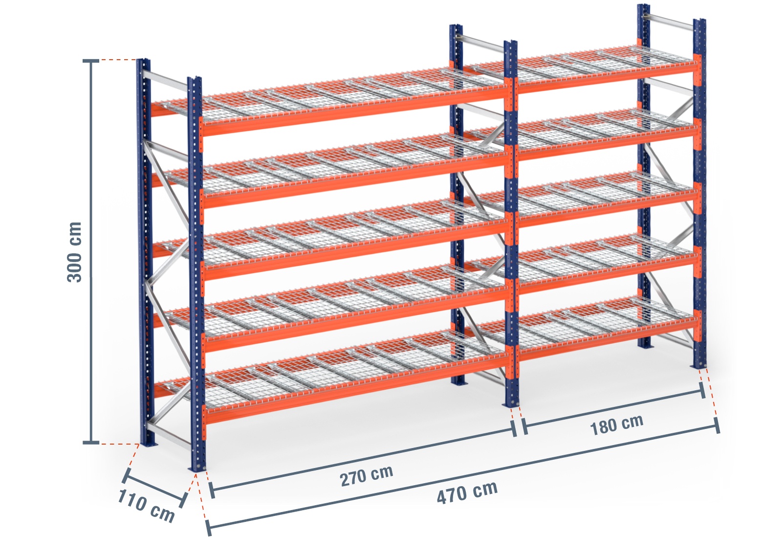 4,7 m pallet racking PR9000 / 110 cm deep / 3 m high / 5 levels / rack layer Wire mesh