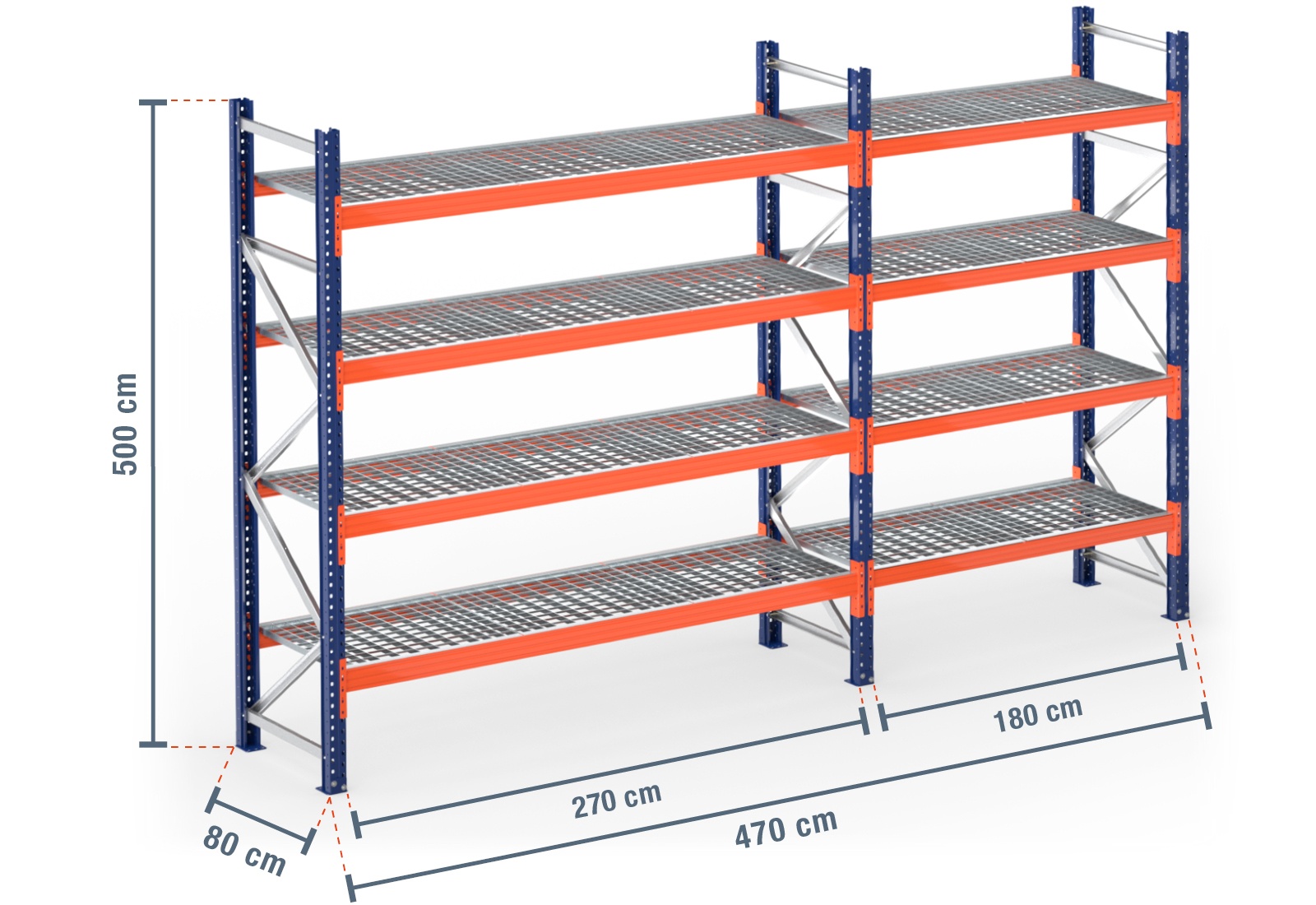 4,7 m pallet racking PR9000 / 80 cm deep / 5 m high / 4 levels / rack layer Galvanised mesh