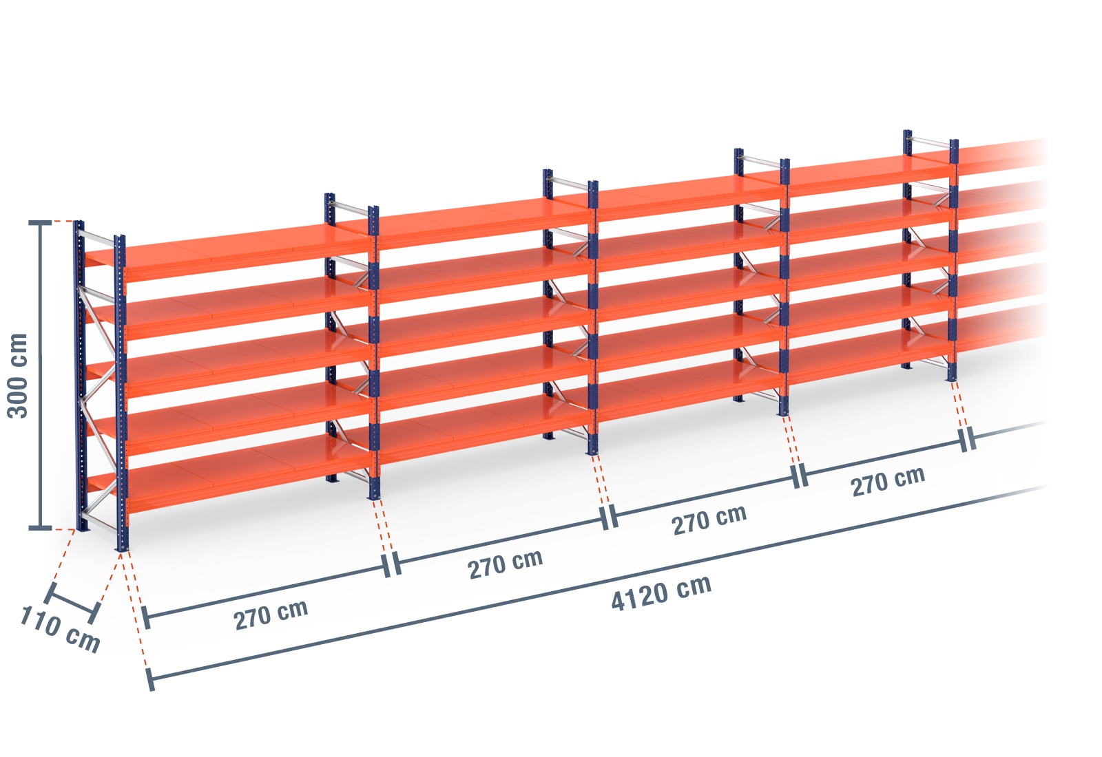 41,2 m pallet racking PR4500 / 110 cm deep / 3 m high / 5 levels / rack layer Steel