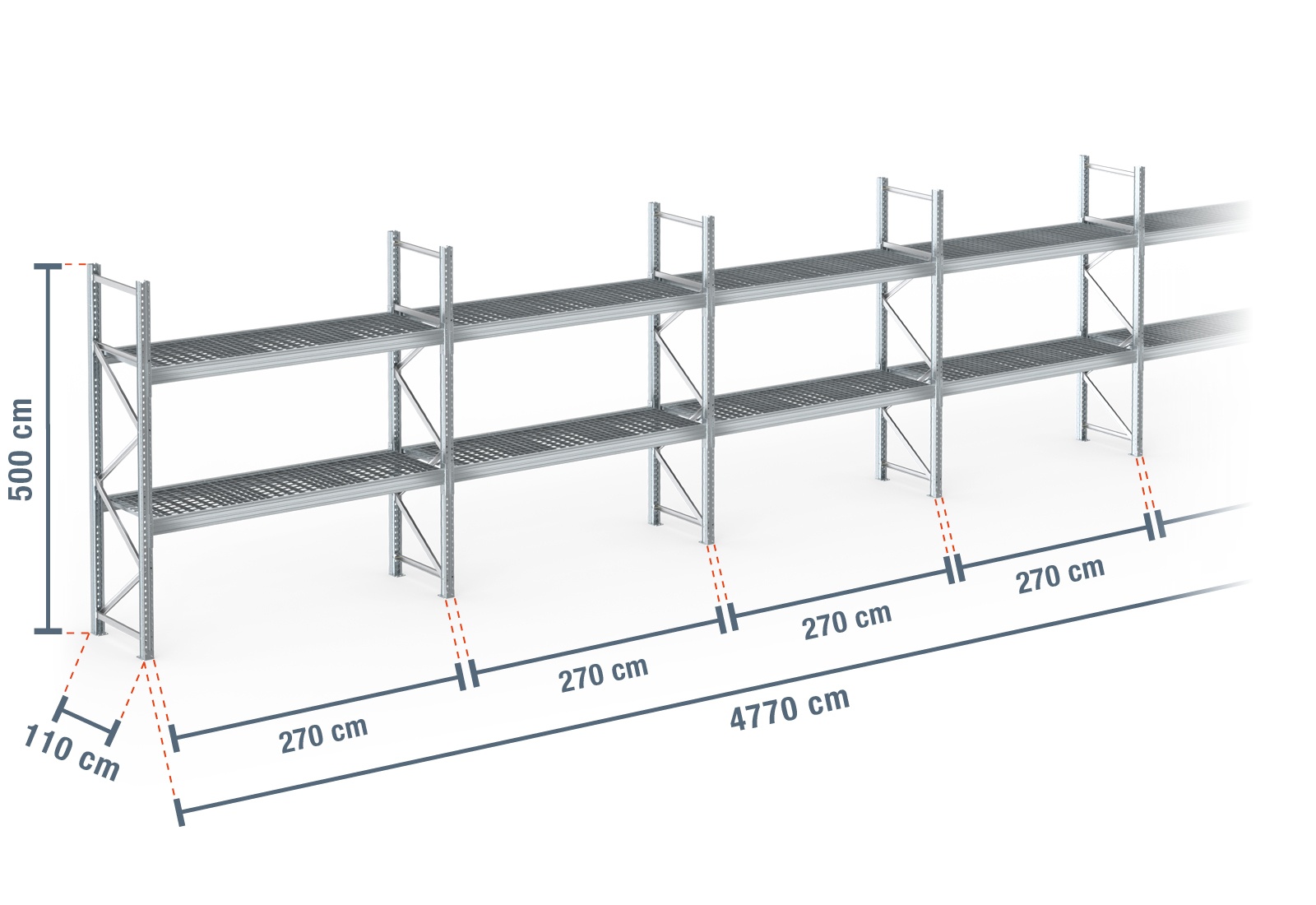 47,7 m pallet rack PR9000F galvanised / 110 cm deep / 5 m high / 2 levels / rack layer Galvanised mesh
