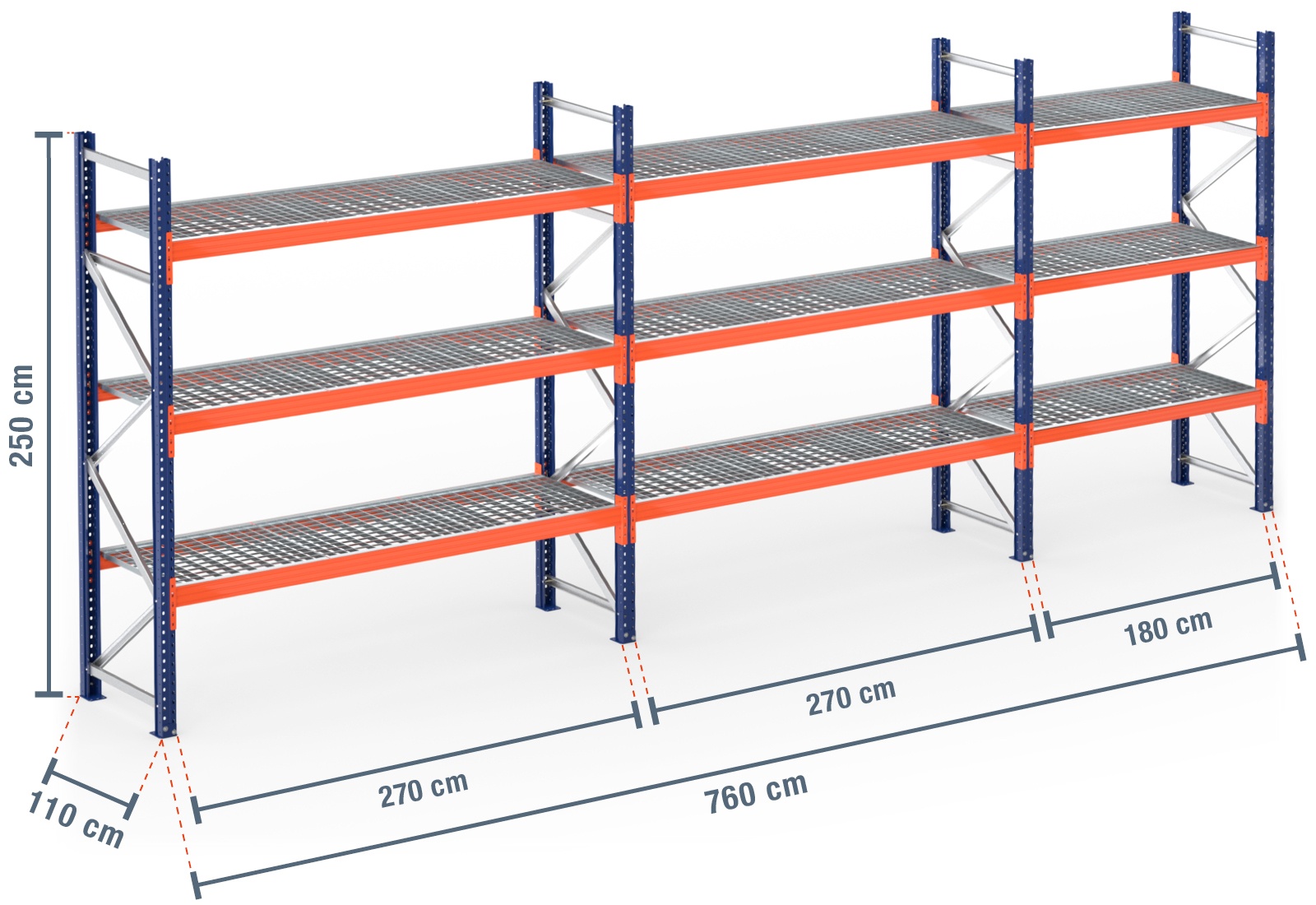 7,6 m pallet rack PR4500 / 110 cm deep / 2,5 m high / 3 levels / shelf Galvanised mesh