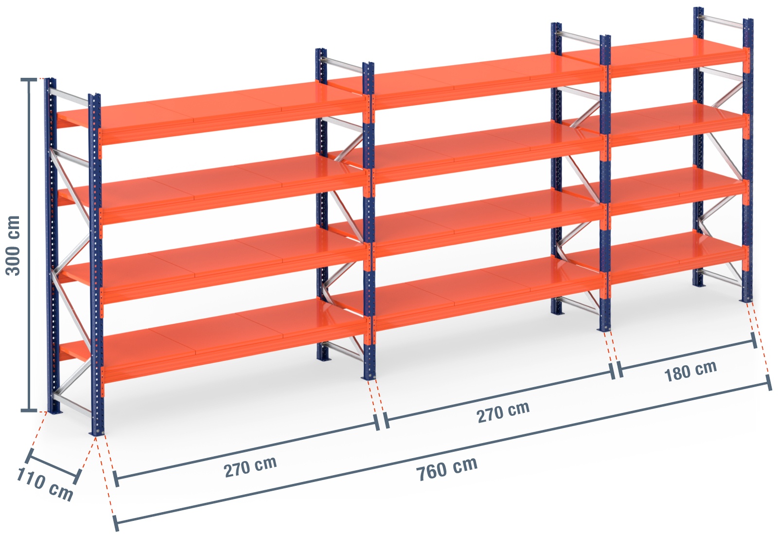 7,6 m pallet racking PR4500 / 110 cm deep / 3 m high / 4 levels / rack layer Steel