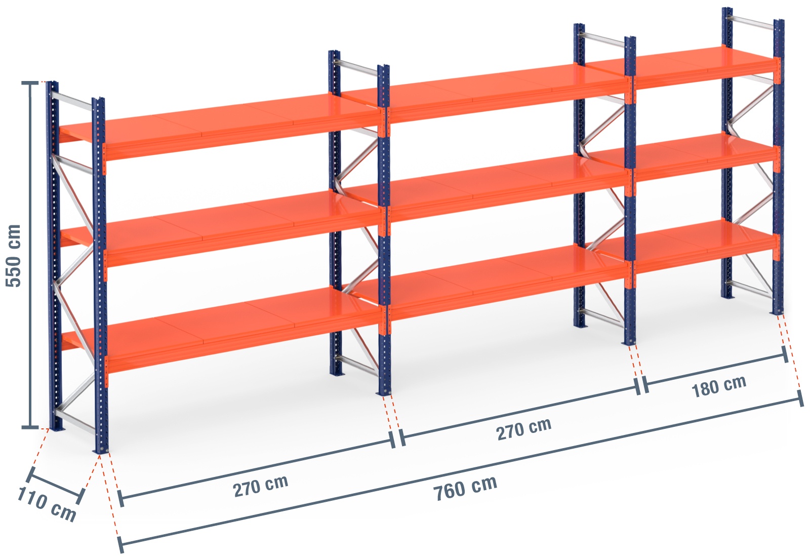 7,6 m pallet racking PR4500 / 110 cm deep / 5,5 m high / 3 levels / rack layer Steel