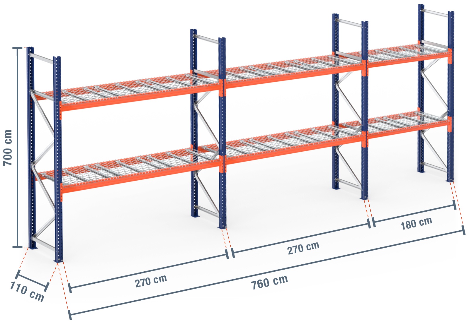 7,6 m pallet racking PR4500 / 110 cm deep / 7 m high / 2 levels / rack layer Wire mesh