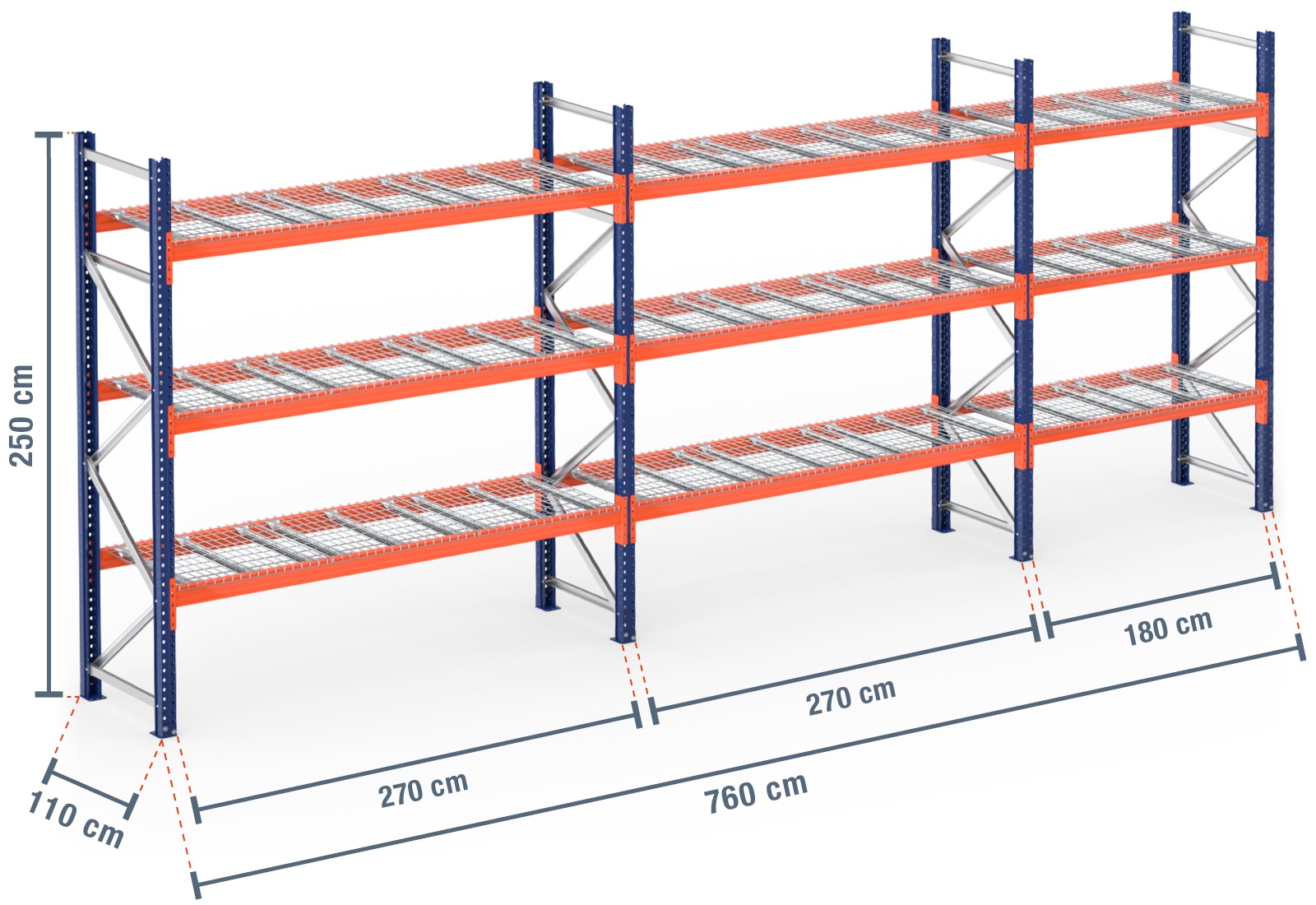 7,6 m pallet racking PR9000 / 110 cm deep / 2,5 m high / 3 levels / rack layer Wire mesh