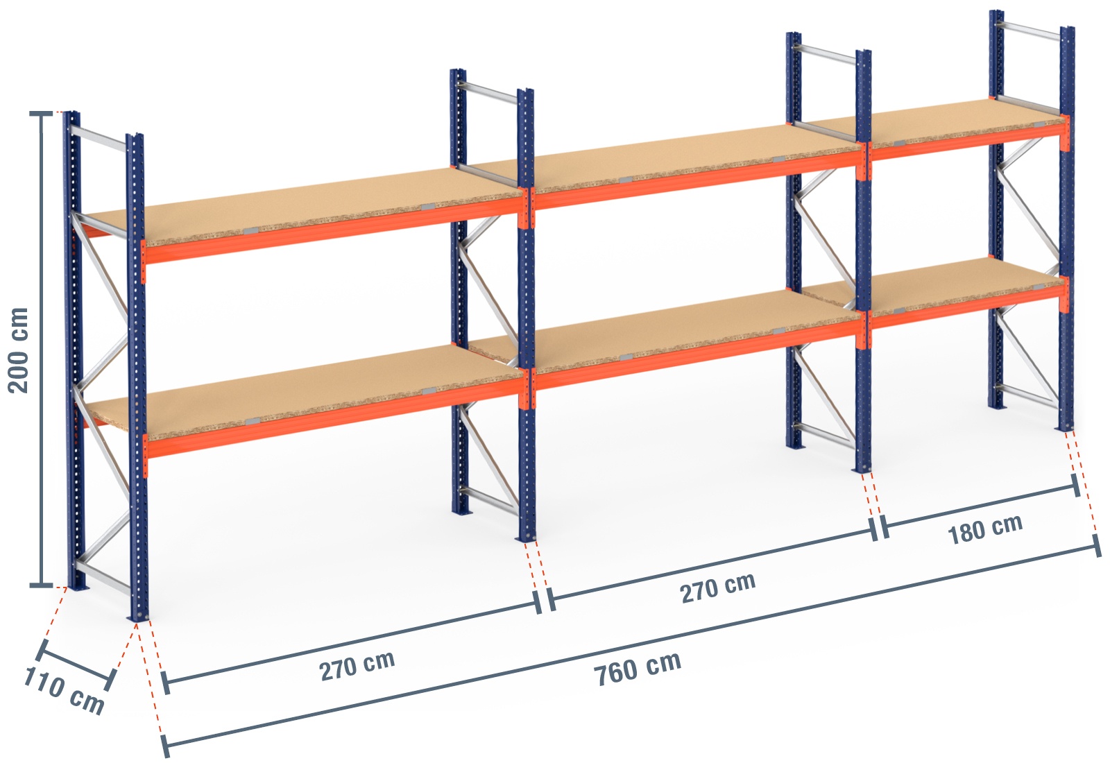 7,6 m pallet racking PR9000 / 110 cm deep / 2 m high / 2 levels / rack layer Wood