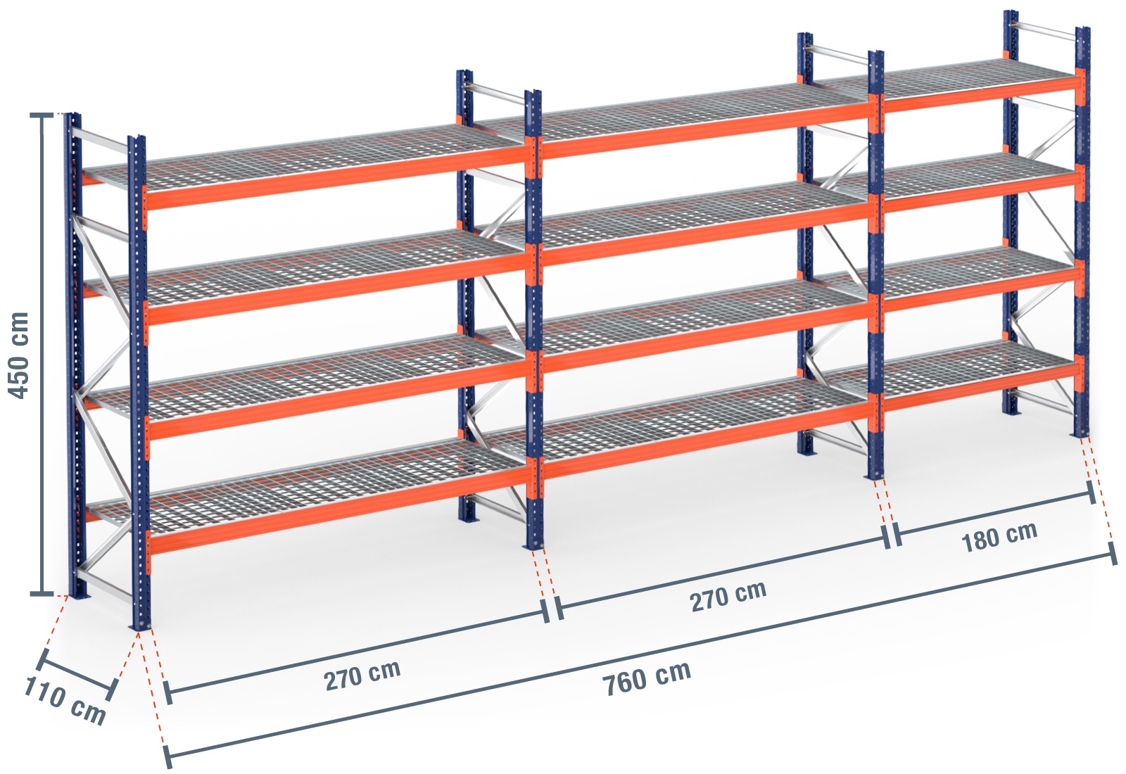7,6 m pallet racking PR9000 / 110 cm deep / 4,5 m high / 4 levels / rack layer Galvanised mesh