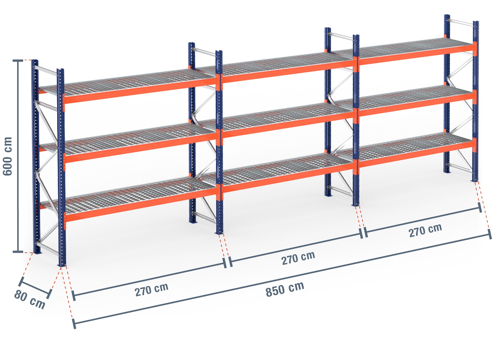 8,5 m pallet rack PR4500 / 80 cm deep / 6 m high / 3 levels / shelf Galvanised mesh