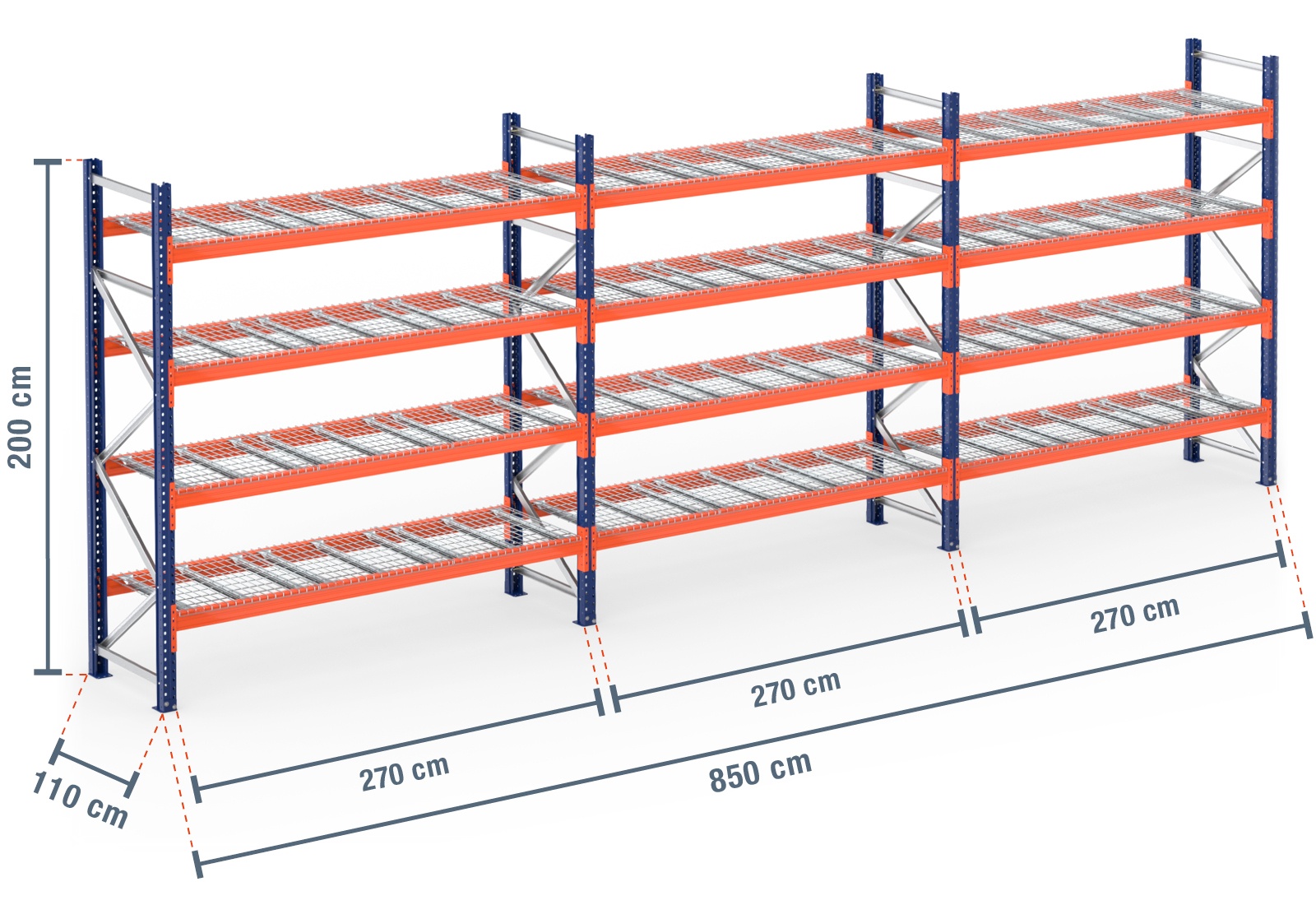 8,5 m pallet racking PR4500 / 110 cm deep / 2 m high / 4 levels / rack layer Wire mesh