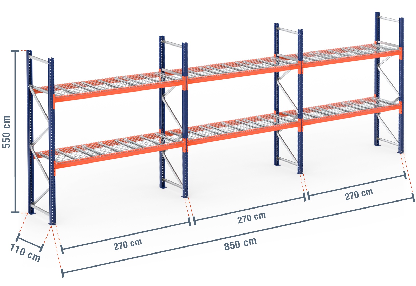 8,5 m pallet racking PR4500 / 110 cm deep / 5,5 m high / 2 levels / rack layer Wire mesh