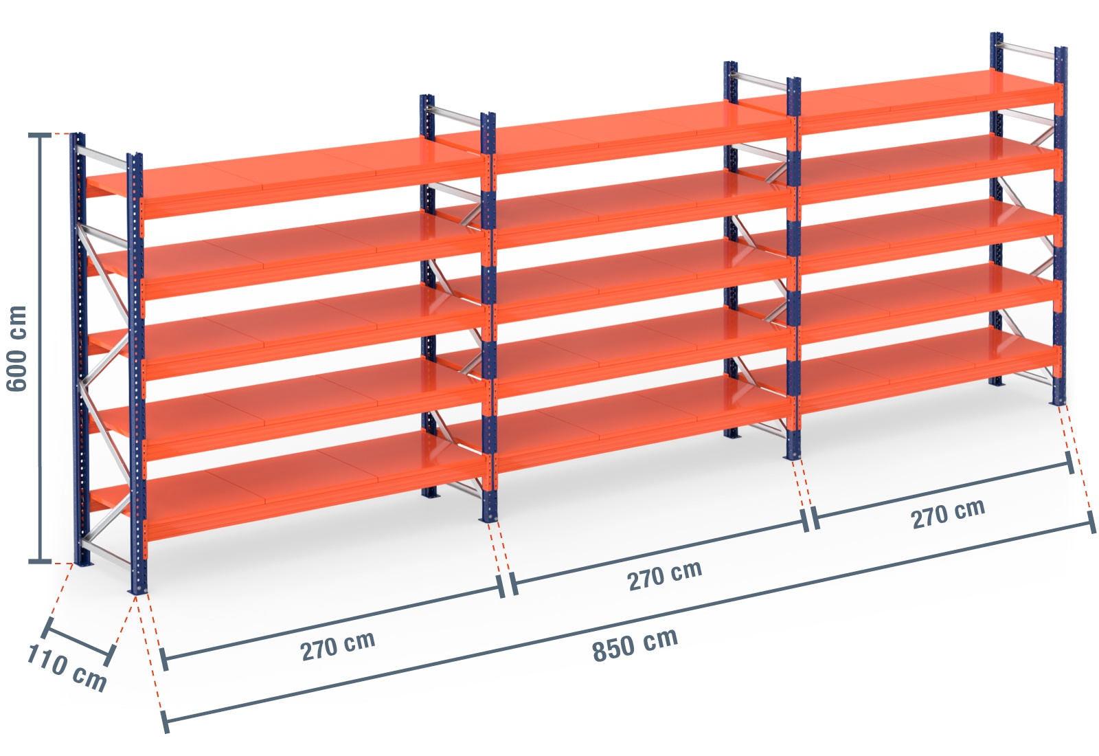 8,5 m pallet racking PR4500 / 110 cm deep / 6 m high / 5 levels / rack layer Steel