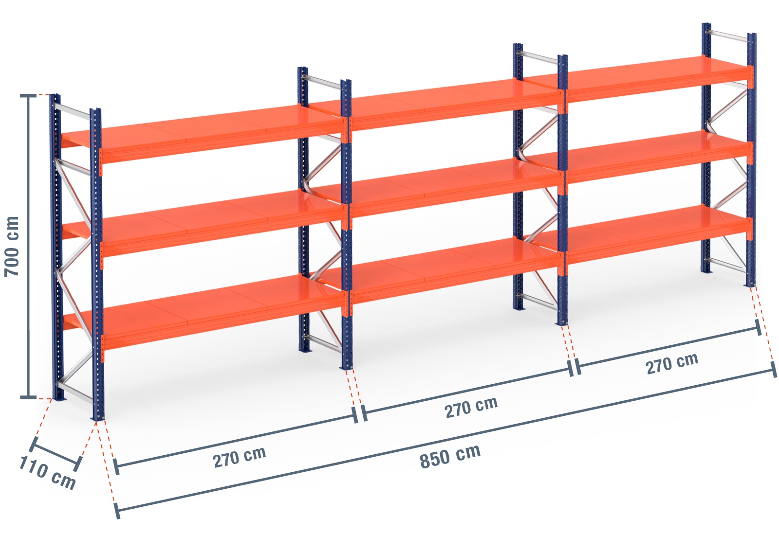8,5 m pallet racking PR4500 / 110 cm deep / 7 m high / 3 levels / rack layer Steel