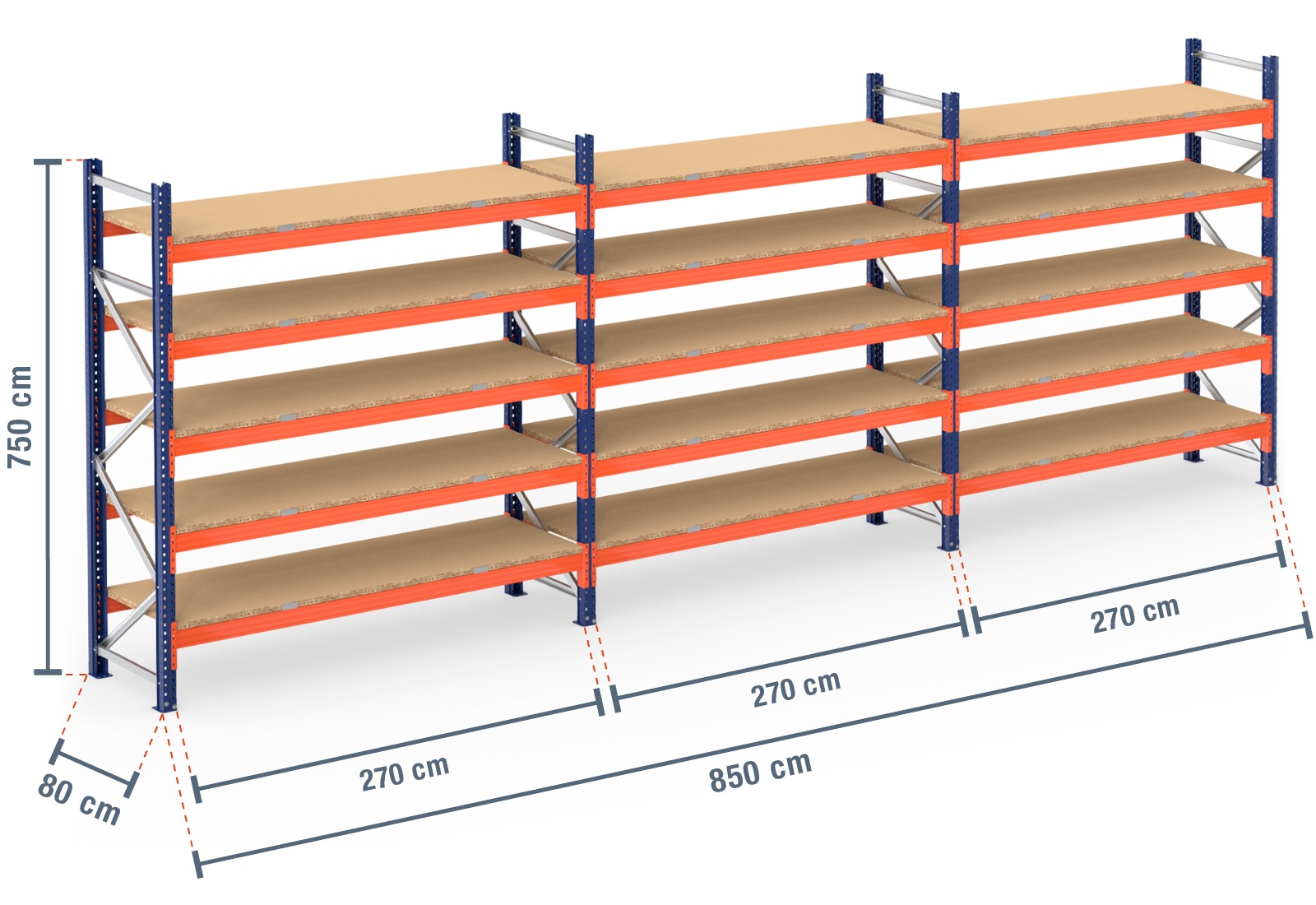 We offer you the common heights from 200 cm to 750 cm. For individual heights, the shelf supports are cut to size on request or manufactured individually according to your requirements.