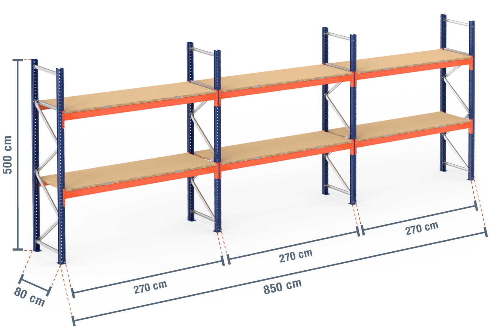 8,5 m pallet racking PR9000 / 80 cm deep / 5 m high / 2 levels / rack layer Wood