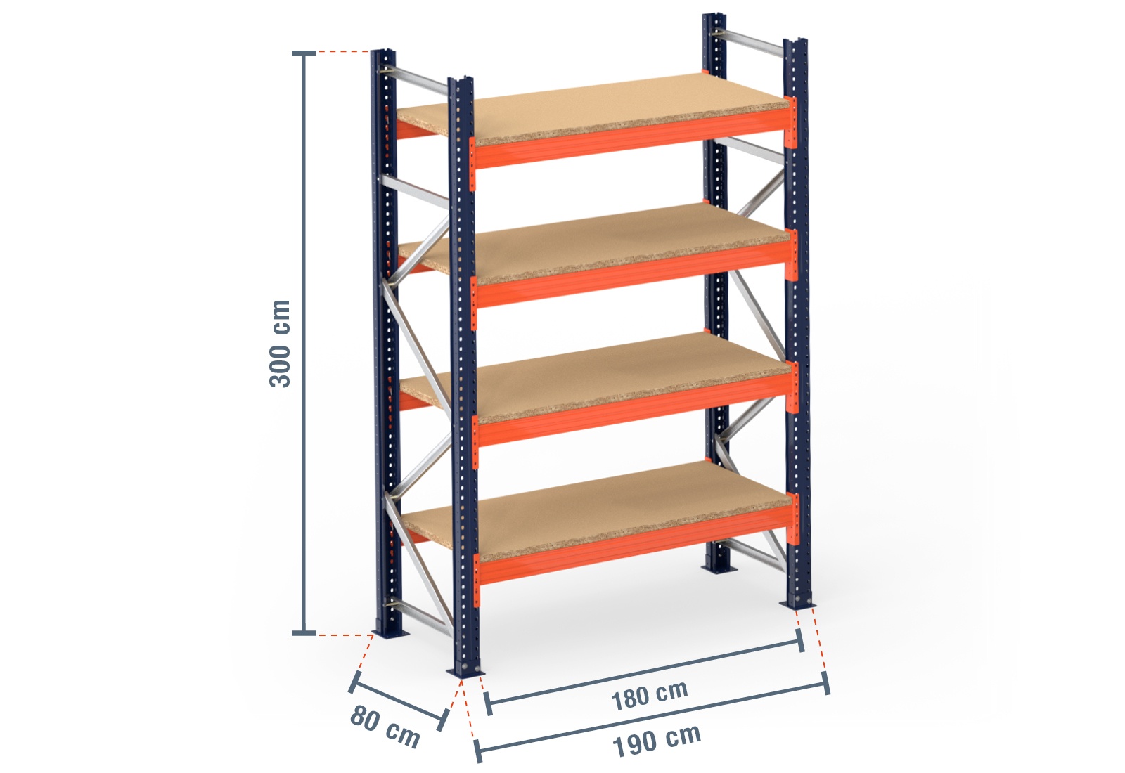 1,9 m pallet racking PR15000 / 80 cm deep / 3 m high / 4 levels / rack layer Wood