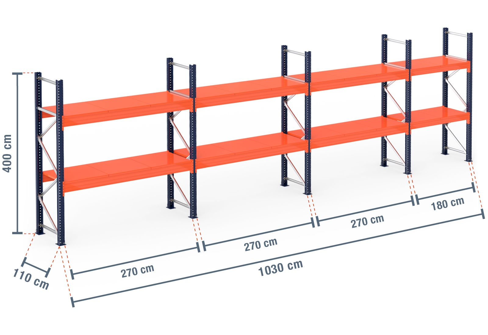 10,3 m pallet racking PR15000 / 110 cm deep / 4 m high / 2 levels / rack layer Steel