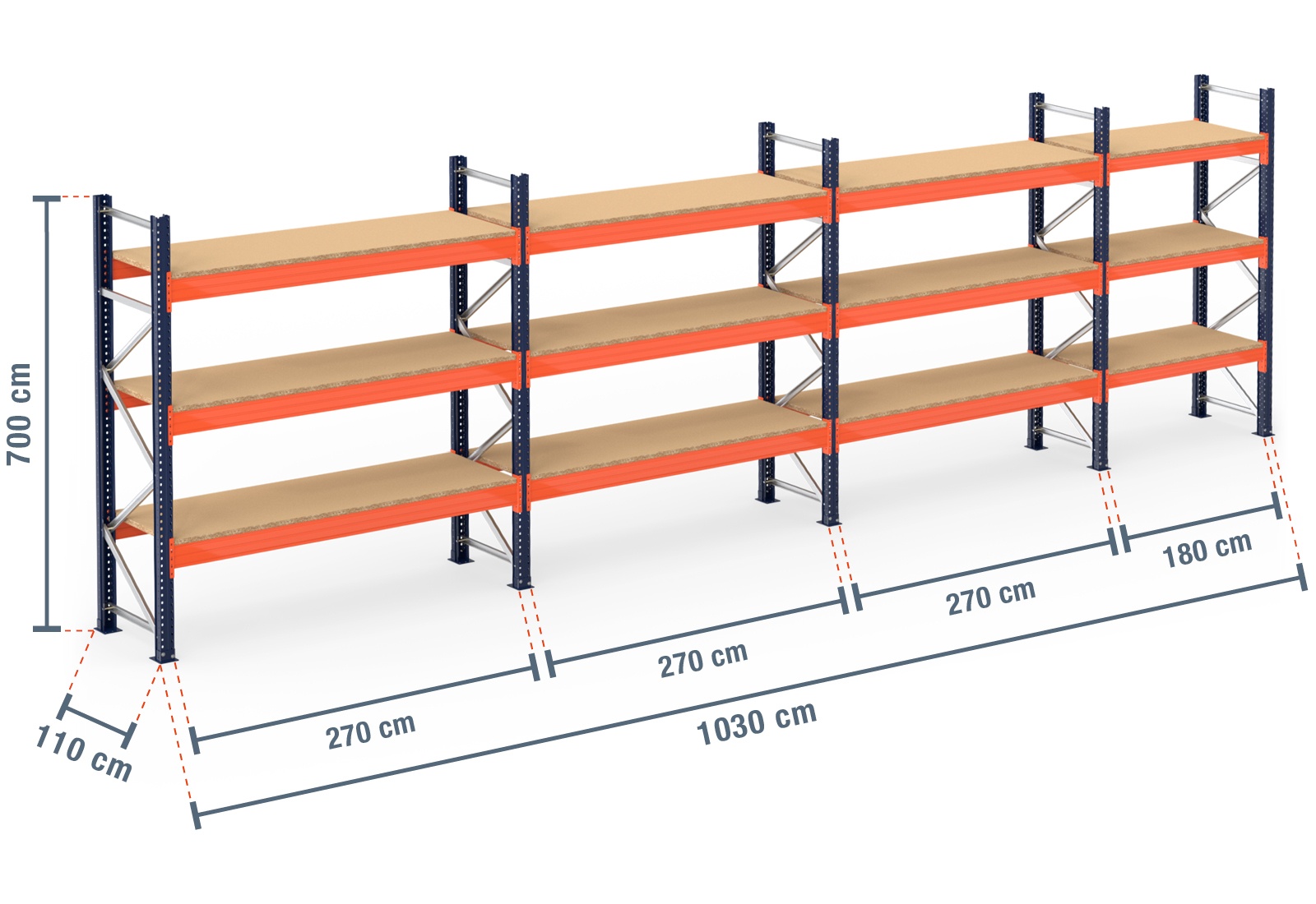 10,3 m pallet racking PR15000 / 110 cm deep / 7 m high / 3 levels / rack layer Wood